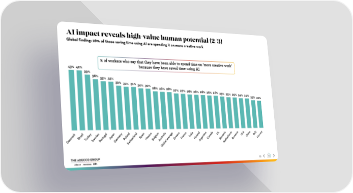 AI impact reveals high-value human potential (2/3) Global finding: 28% of those saving time using AI are spending it on more creative work % of workers who say that they have been able to spend time on ‘more creative work’ 43% 42% because they have saved time using AI 39% 36% 35% 35% 32% 31% 31% 30% 30% 28% 28% 28% 27% 27% 26% 26% 26% 26% 26% 25% 25% 25% 24% 24% 23% 22% 75