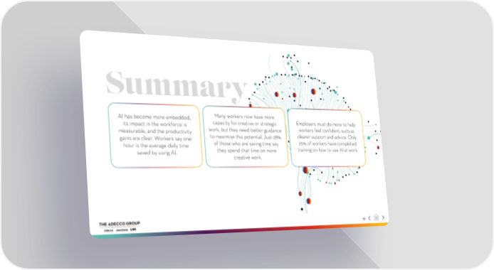 Summary AI has become more embedded, Many workers now have more its impact in the workforce is capacity for creative or strategic Employers must do more to help measurable, and the productivity work, but they need better guidance workers feel confident, such as gains are clear. Workers say one to maximise this potential. Just 28% clearer support and advice. Only hour is the average daily time of those who are saving time say 25% of workers have completed saved by using AI. they spend that time on more training on how to use AI at work. creative work. 35
