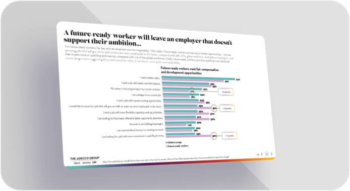 A future-ready worker will leave an employer that doesn't support their ambition... For future-ready workers, fair pay and development are non-negotiables. After salary, future-ready workers are leaving for better opportunities – 32% are pursuing jobs that will give them skills to become more employable in the future, compared with 23% of the global workforce. And 30% are looking for a job that invests more in upskilling and training, compared with 19% of the global workforce. Finally, future-ready workers prioritise upskilling over traditional career progression, suggesting they understand the value of non-linear career paths and adaptability. Future-ready workers want fair compensation and development opportunities I want a better salary 42% 51% I want a job with better work-life balance 32% 33% My career is not progressing in my current company 17% 27% - 10 points I am unhappy in my current job 18% 24% I want a job with remote-working opportunities 24% 28% I would like to move to a job that will give me skills to make me more employable in the future 23% 32% + 9 points I want a job with more flexibility regarding working schedules 22% 30% I am looking for/have been offered a better opportunity elsewhere 21% 30% My work is not fulfilling/meaningful 14% 20% I am worried about burnout or working too much 20% 18% I am looking for a job with more investment in upskilling/training 19% 30% + 11 points Global average Future-ready workers Q24: You said that you would like to leave your job in the next 12 months. Which of the following best describes why you would like to make this change? 23