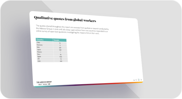Qualitative quotes from global workers The quotes shared throughout this report are excerpts from qualitative research conducted by the Adecco Group in June and July 2024. 1,443 workers from nine countries responded to an online survey of open-text questions investigating the impact of AI on their work. Country Sample Chile 15 Germany 3 Italy 331 Japan 150 Mexico 1 Peru 74 Spain 633 UK 14 USA 222 64