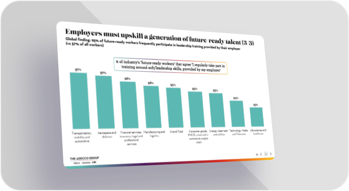 Employers must upskill a generation of future-ready talent (3/3) Global finding: 95% of future-ready workers frequently participate in leadership training provided by their employer (vs 57% of all workers) % of industry’s ‘future-ready workers’ that agree ‘I regularly take part in training around soft/leadership skills, provided by my employer’ 97% 97% 96% 96% 95% 95% 95% 94% 93% Transportation, Aerospace and Financial services, Manufacturing and Grand Total Consumer goods, Energy, clean tech Technology, Media Life sciences and mobility and defence insurance, legal and logistics FMCG, retail and e- and utilities and Telecoms healthcare automotive professional commerce, supply services chain 86