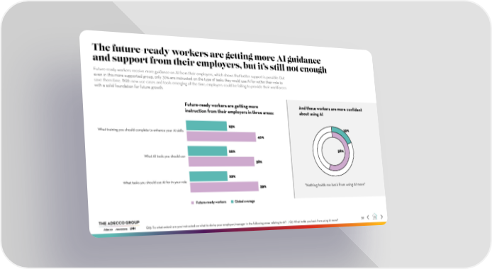 The future-ready workers are getting more AI guidance and support from their employers, but it’s still not enough Future-ready workers receive more guidance on AI from their employers, which shows that better support is possible. But even in this more supported group, only 39% are instructed on the type of tasks they could use AI for within their role to save them time. With new use cases and tools emerging all the time, employers could be failing to provide their workforces with a solid foundation for future growth. Future-ready workers are getting more And these workersare more confident instruction from their employers in three areas: about usingAI 23% 19% What training you should complete to enhance your AI skills 40% 22% 56% What AI tools you should use 38% 22% What tasks you should use AI for in your role 39% "Nothing holds me back from using AI more" Future-ready workers Global average Q13: To what extent are you instructed on what to do by your employer/manager in the following areas relating to AI? | Q7: What holds you back from using AI more? 39