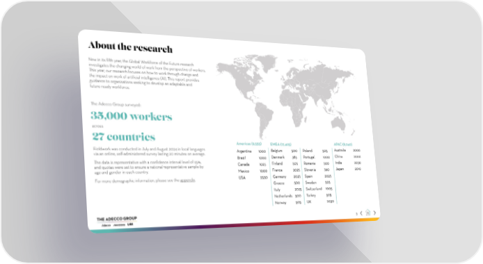 About the research Now in its fifth year, the Global Workforce of the Future research investigates the changing world of work from the perspective of workers. This year, our research focuses on how to work through change and the impact on work of artificial intelligence (AI). This report provides guidance to organisations seeking to develop an adaptable and future-ready workforce. The Adecco Group surveyed: 35,000 workers across 27 countries Americas (9,555) EMEA (17,405) APAC (8,040) Fieldwork was conducted in July and August 2024 in local languages Argentina 1000 Belgium 500 Poland 505 Australia 2000 via an online, self-administered survey lasting 20 minutes on average. Denmark 385 Portugal 1000 China 2000 Brazil 1000 The data is representative with a confidence interval level of 95%, Canada 1025 Finland 505 Romania 500 India 2030 and quotas were set to ensure a national representative sample by Japan 2010 age and gender in each country. Mexico 1000 France 2025 Slovenia 360 . USA 5530 Germany 2025 Spain 2025 For more demographic information, please see the appendix Greece 500 Sweden 505 Italy 2025 Switzerland 1005 Netherlands 500 Turkey 505 Norway 505 UK 2030 3