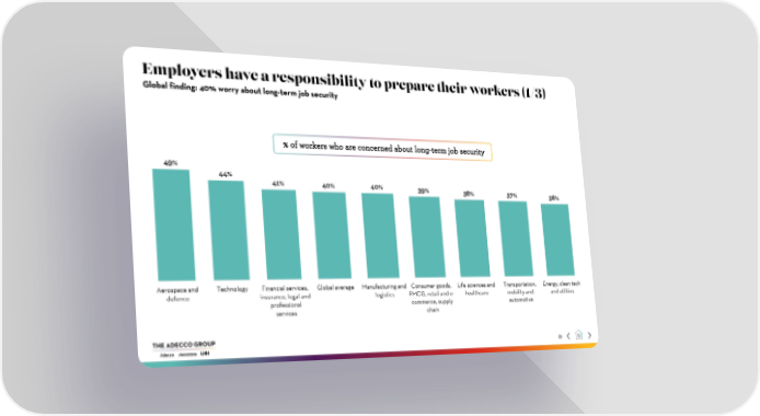 Employers have a responsibility to prepare their workers (1/3) Global finding: 40% worry about long-term job security % of workers who are concerned about long-term job security 49% 44% 41% 40% 40% 39% 38% 37% 36% Aerospace and Technology Financial services, Global average Manufacturing and Consumer goods, Life sciences and Transportation, Energy, clean tech defence insurance, legal and logistics FMCG, retail and e- healthcare mobility and and utilities professional commerce, supply automotive services chain 81