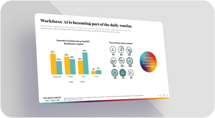 Workforce AI is becoming part of the daily routine There has been a significant rise in the numbers of workers who use AI every day: from 31% in 2023 to 48% in 2024. The average time saved per day is one hour although a fifth of users said the technology was saving them as many as two hours a day. Generative AI (tools such as ChatGPT, Time saved per day by using AI Bard/Gemini, Copilot) No 1-15 15-30 40% time mins mins 37% 3% 8% 17% 32% 28% The average 24% 25% 30-45 45-60 1-2 time saved per mins mins hours day by using AI 19% 21% 20% is one hour 6% 8% 3-4 5+ Don’t hours hours know Occasionally Weekly Daily Hourly 5% 1% 4% 2023 2024 Q8: How often do you use GenAIat work? (Base: Those who use AI at work) | Q9: How much time do you save per day using AI? - Mean average calculation 37 (Base: Those who use AI at work)