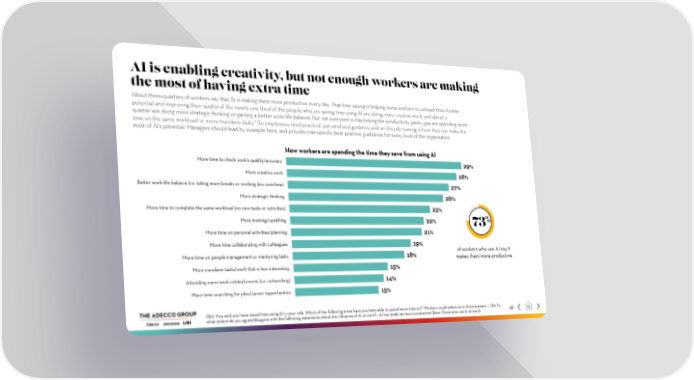 AI is enabling creativity, but not enough workers are making the most of having extra time About three-quarters of workers say that AI is making them more productive every day. That time saving is helping some workers to unleash their human potential and improving their quality of life: nearly one-third of the people who are saving time using AI are doing more creative work, and about a quarter are doing more strategic thinking or gaining a better work-life balance. But not everyone is maximising the productivity gains: 35% are spending more time on the same workload or more mundane tasks.* So employees need practical, personalised guidance and on-the-job training in how they can make the most of AI's potential. Managers should lead by example here, and provide role-specific best practice guidelines for every level of the organisation. How workers are spending the time they save from using AI More time to check work's quality/accuracy 29% More creative work 28% Better work-life balance (i.e. taking more breaks or working less overtime) 27% More strategic thinking 26% More time to complete the same workload (no new tasks or activities) 23% More training/upskilling 22% 73% More time on personal activities/planning 21% More time collaborating with colleagues 19% More time on people management or mentoring tasks 18% of workers who use AI say it makes them more productive More mundane tasks/work that is less interesting 15% Attending more work-related events (i.e. networking) 14% More time searching for jobs/career opportunities 13% Q10: You said you have saved time using AI in your role. Which of the following areas have you been able to spend more time on? *Workers could select up to three answers | Q11: To 38 what extent do you agree/disagree with the following statements about the influence of AI at work? - AI has made me more productive (Base: Those who use AI at work)
