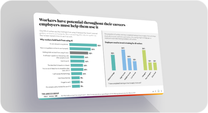 Workers have potential throughout their careers – employers must help them use it One-fifth of workers say they hold back from using AI because they haven’t received The proportion of workers who have completed training in how to apply AI at work drops guidance on how to use it properly. This is unsurprising when only one-quarter say drastically for junior and lower-paid workers. It's creating a big knowledge gap, so they’ve been trained in how to use AI at work. employers must make training available to all workers. Why workers hold back from using AI Employers need to invest in training for all workers It's not relevant to my job/role 29% 34% 34% There is no guidance on how to use it properly 22% Nothing holds me back from using AI more 19% 25% It will mean I speak to or interact less with 14% 20% other people at work 15% I don't trust AI 14% 13% 13% The data that it's based on is biased 12% I've run out of ideas how to streamline other 12% tasks with AI I can't access the technology 11% I don't have the time 8% I forget to use it 8% "I have completed training on how to apply AI at work" My company policy forbids the use of AI 8% Q7: What holds you back from using AI more? | Q11v2: To what extent do you agree/disagree with the following statements about the influence of AI? 40