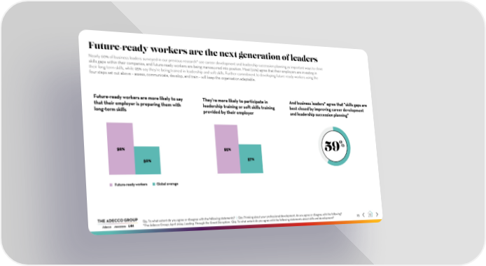 Future-ready workers are the next generation of leaders Nearly 60% of business leaders surveyed in our previous research* see career development and leadership succession planning as important ways to close skills gaps within their companies, and future-ready workers are being manoeuvred into position. Most (92%) agree that their employers are investing in their long-term skills, while 95% say they’re being trained in leadership and soft skills. Further commitment to developing future-ready workers using the four steps set out above – assess, communicate, develop, and train – will keep the organisation adaptable. Future-ready workers are more likely to say They’re more likely to participate in And business leaders* agree that "skills gaps are that their employer is preparing them with leadership training or soft skills training best closed by improving career development long-term skills provided by their employer and leadership succession planning" 92% 95% 59% 50% 57% Future-ready workers Global average Q5: To what extent do you agree or disagree with the following statements? | Q21: Thinking about your professional development, do you agree or disagree with the following? 25 *The Adecco Group, April 2024, Leading Through the Great Disruption: Q14. To what extent do you agree with the following statements about skills and development?