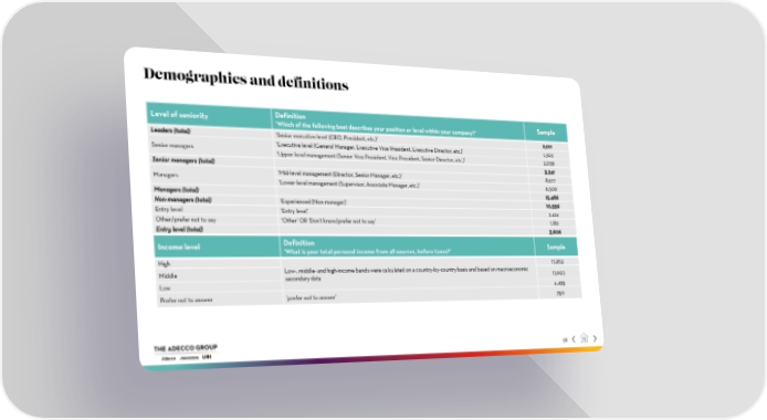 Demographics and definitions Level of seniority Definition Sample ‘Which of the following best describes your position or level within your company?’ Leaders (total) ‘Senior executive level (CEO, President, etc.)’ 2,011 Senior managers ‘Executive level (General Manager, Executive Vice President, Executive Director, etc.)’ 1,303 ‘Upper-level management (Senior Vice President, Vice President, Senior Director, etc.)’ 2,038 Senior managers (total) 3,341 Managers ‘Mid-level management (Director, Senior Manager, etc.)’ 8,977 ‘Lower-level management (Supervisor, Associate Manager, etc.)’ 6,509 Managers (total) 15,486 Non-managers (total) ‘Experienced (Non-manager)’ 10,556 Entry level ‘Entry level’ 2,424 Other/prefer not to say ‘Other’ OR ‘Don’t know/prefer not to say’ 1,182 Entry level (total) 3,606 Income level Definition Sample ‘What is your total personal income from all sources, before taxes?’ High 15,852 Middle Low-, middle-and high-income bands were calculated on a country-by-country basis and based on macroeconomic 13,903 secondary data Low 4,495 Prefer not to answer ‘prefer not to answer’ 750 58