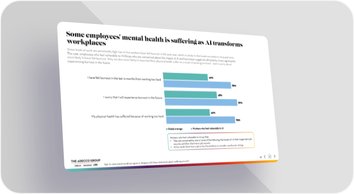 Some employees' mental health is suffering as AI transforms workplaces Stress levels at work are persistently high: two in five workers have felt burnout in the past year, which is similar to the levels recorded in 2023 and 2022. This year, employees who feel vulnerable to AI (those who are concerned about the impact of AI and have been negatively affected by it) are significantly more likely to have felt burnout. They are also more likely to have had their physical health suffer as a result of working too hard – and to worry about experiencing burnout in the future. 40% I have felt burnout in the last 12 months from working too hard 62% 48% I worry that I will experience burnout in the future 67% 40% My physical health has suffered because of working too hard 63% Global average Workers who feel vulnerable to AI Workers who feel vulnerable to AI say that: • They are concerned by one or more of the following: the impact of AI, their longer-term job security and their short-term job security • AI has made them lose a job or has forced them to consider a profession change Q31: To what extent would you agree or disagree with these statements about wellbeing at work? 45