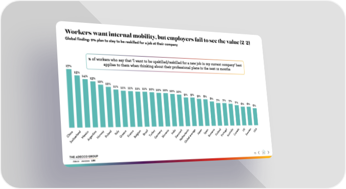 Workers want internal mobility, but employers fail to see the value (2/2) Global finding: 9% plan to stay to be reskilled for a job at their company % of workers who say that ‘I want to be upskilled/reskilled for a new job in my current company’ best 17% applies to them when thinking about their professional plans in the next 12 months 15% 14% 13% 12% 12% 11% 11% 11% 11% 11% 10% 10% 10% 10% 10% 9% 9% 9% 8% 8% 7% 7% 7% 7% 6% 6% 6% 73