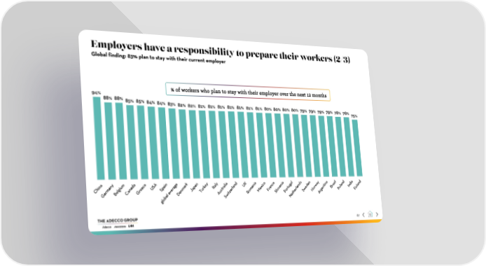 Employers have a responsibility to prepare their workers (2/3) Global finding: 83% plan to stay with their current employer % of workers who plan to stay with their employer over the next 12 months 94% 88% 88% 85% 85% 84% 84% 83% 82% 82% 81% 81% 81% 81% 81% 81% 81% 80% 80% 80% 80% 79% 79% 79% 79% 78% 78% 75% 67