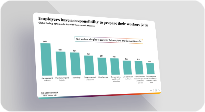 Employers have a responsibility to prepare their workers (2/3) Global finding: 83% plan to stay with their current employer % of workers who plan to stay with their employer over the next 12 months 90% 86% 85% 84% 83% 83% 81% 81% 80% Aerospace and Manufacturing and Technology Energy, clean tech Global average Transportation, Life sciences and Financial services, Consumer goods, defence logistics and utilities mobility and healthcare insurance, legal and FMCG, retail and e- automotive professional commerce, supply services chain 82