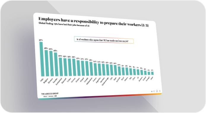Employers have a responsibility to prepare their workers (3/3) Global finding: 13% have lost their jobs because of AI 37% % of workers who agree that ‘AI has made me lose my job’ 28% 27% 26% 20% 19% 19% 19% 17% 17% 17% 16% 14% 14% 13% 13% 13% 12% 10% 9% 9% 8% 8% 7% 6% 5% 4% 4% 68