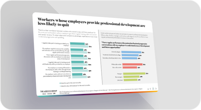 Workerswhose employers provide professional developmentare less likely to quit There's a clear correlation between workers who intend to stay with their employer for Some worker groups are better served when it comes to professional development. the next year and workers whose employers give them regular training, skills assessment White-collar workers, managers and workers with degrees are all more likely to have and career reviews. To retain talent and competitive advantage, organisations must invest regular professional performance reviews or discussions. in internal progression and upskilling. “I have regular performance discussions/professional progression I regularly take part in training provided by my 54% conversations with my employer to understand areas of development employer 67% and future opportunities” My employer regularly assesses the suitability 48% and relevance of my current skills (e.g. through 61% University degree 61% regular performance reviews) I have regular performance/progression 46% Vocational school/technical college 51% discussions with my employer to understand 61% Secondary school/equivalent or less 46% areas of development I regularly take part in training around 46% soft/leadership skills, provided by my employer 60% White-collar worker 61% My employer is investing effectively in 42% Blue-collar worker 43% developing my skills, either through formal 59% training or on-the-job learning My employer works with me to me devise a 38% Managers 67% personalised professional/career development 54% plan Non-managers 48% Entry level 41% Intend to quit in the next 12 months Intend to stay with employer for the next 12 months Q21: Thinking about your professional development, do you agree or disagree with the following? | Q21: Thinking about your professional development, do you agree or disagree 32 with the following?