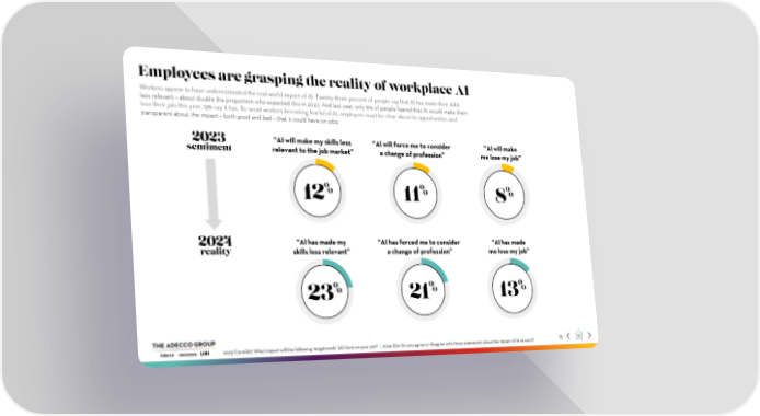 Employees are grasping the reality of workplace AI Workers appear to have underestimated the real-world impact of AI. Twenty-three percent of people say that AI has made their skills less relevant – about double the proportion who expected this in 2023. And last year, only 8% of people feared that AI would make them lose their job; this year, 13% say it has. To avoid workers becoming fearful of AI, employers must be clear about its opportunities and transparent about the impact – both good and bad – that it could have on jobs. 2023 “AI will make my skills less “AI will force me to consider “AI will make sentiment relevant to the job market” a change of profession” me lose my job” % % % 12 11 8 2024 “AI has made my “AI has forced me to consider “AI has made reality skills less relevant” a change of profession” me lose my job” % % % 23 21 13 2023 CoreQ27 What impact will the following 'megatrends’ (AI) have on your job? | 2024 Q12: Do you agree or disagree with these statements about the impact of AI at work? 13