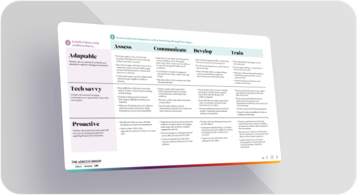 1 Invest in talent development as well as technology through four stages… 2 to build a future-ready Assess Communicate Develop Train workforce that is… • Employers need to carry out an honest • Organisations must clearly and transparently • Align with the fundamental shift to a skills-based • Teach adaptability through regular training Adaptable appraisal of the future of work and educate communicate the impacts of emerging economy and away from a jobs-based one and development workers about their prospects technology on the company and its workforce • Provide transparent guidance on skills needs for • Provide regular upskilling – not just technical Workers who are enabled to be flexible and • Empower managers with data-driven tools to to support employees through times of next career steps skills but also human skills. adaptable to adjust to changing environments understand, assess and predict skills needs uncertainty and plan the talent pipeline. A shared skills • Coach leaders to be able to engage and • Match individuals’ skills to in-demand future • Make sure workers understand therelevance taxonomy is vital here. motivate all levels of the workforce through careers and embed these insights into of upskilling programmes to their role and change personalised career development plans progression plan • Continuously assess current and future skills • Make training formal and informal, multi- needs and apply insights to workforce • Educate workers in the importance and value modular and continuous planning of transferable skills • Ensure effective collaboration across the • Adopt a people-centric approach to • Free up workers’ time to focus on strategic • Provide on-the-job training to ensure workers Tech savvy entire C-Suite to connect business strategy technology transformation and clearly and creative work that requires uniquely apply digital and data literacy to their daily and HR strategy communicate this commitment to the human skills: make this the goal of AI tasks and activities Workers who approach emerging • Evaluate existing access to tools and workforce workflow integration • Develop responsible AI frameworks and technologies as an opportunity to learn skills technology to highlight and address any • Promote a culture of growth and resilience • Ensure that there are regular personalised guidance to ensure workers use AI and progress inequality among workers career conversations, powered by data- appropriately and effectively and increase trust • Make sure AI-related policy and workforce • Ensure leaders address concerns driven tools, for all workers in the technology planning consider inclusiveness, safety, transparently and positively to create more • Promote upskilling and internal mobility to • Develop a responsible AI training programme transparency, privacy and accountability trust, openness and advocacy maintain a sustainable balance between • Ensure all leaders are upskilled on AI and are building and buying talent adopting new technology • Identify and tackle any issues of talent • Organisations should proactively inform the • Prioritise skills-based hiring and ensure roles • Create an organisational and leadership Proactive hoarding across teams and departments workforce about the impacts of emerging are skills-defined culture that promotes continuous upskilling • Match workers’ skills to the technology on the business to maintain • Celebrate transferable skills by consistently and empowers workers to take ownership of Workers who proactively experiment with organisation'sneeds and to their own career engagement and trust onboarding workers from different industries their own training new ways of working and commit to plans • Educate managers to challenge traditional and backgrounds with confidence and • Recognise your company’s need for human upskilling themselves for the future career paths and employment models conviction skills and make them a core part of the talent • Create an organisational culture that • Create non-linear skills-based career lifecycle – from hiring to progression. promotes internal mobility and non-linear pathways for all workers • Leaders should act as a role model, pathways developing their own human skills with coaching, training and leadership development. 53