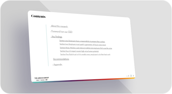 Contents - About the research - Foreword from our CEO - Key findings Section one: Employers have a responsibility to prepare their workers Section two: Employers must upskill a generation of future-ready talent Section three: Workers want internal mobility, but employers fail to see the value Section four: AI impact reveals high-value human potential Section five: Build trust in AI to enable every employee to do their best work - Recommendations - Appendix 2